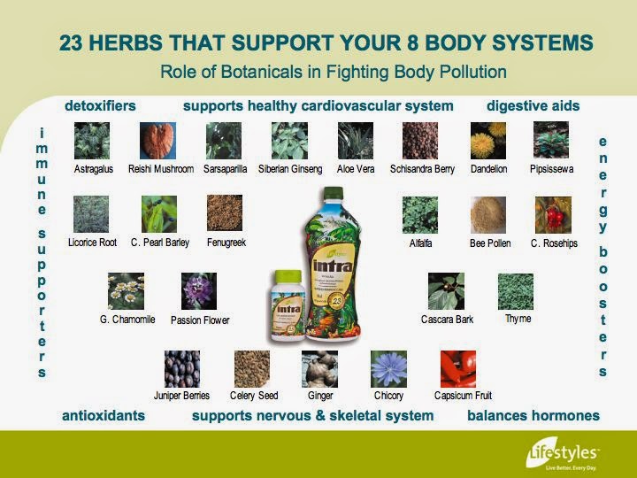 Intra's precise formula of 23 botanical extracts work better together to help balance and strengthen the body's eight biological systems.